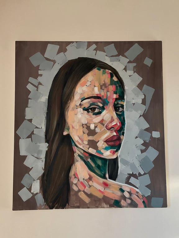 Bu eser, bir kadının içsel dünyasının ve dış dünyayla olan ilişkisinin renklerle anlatımıdır. Her bir renk ve fırça darbesi, kadının hayatındaki farklı anları ve duyguları temsil eder. Yüzündeki karmaşık renk paleti, hem mutluluğun hem de hüznün izlerini taşır. Renkler, onun kimliğini oluşturan parçaları ve yaşadığı deneyimlerin izlerini ortaya koyar. Kadının yüzündeki her bir renk tonu, onun içsel yolculuğunda attığı adımların, karşılaştığı zorlukların ve hissettiği sevginin bir yansımasıdır. Bu resim, izleyiciyi kadının dünyasına davet eder ve onun hikayesini renkler aracılığıyla keşfetmeye çağırır.