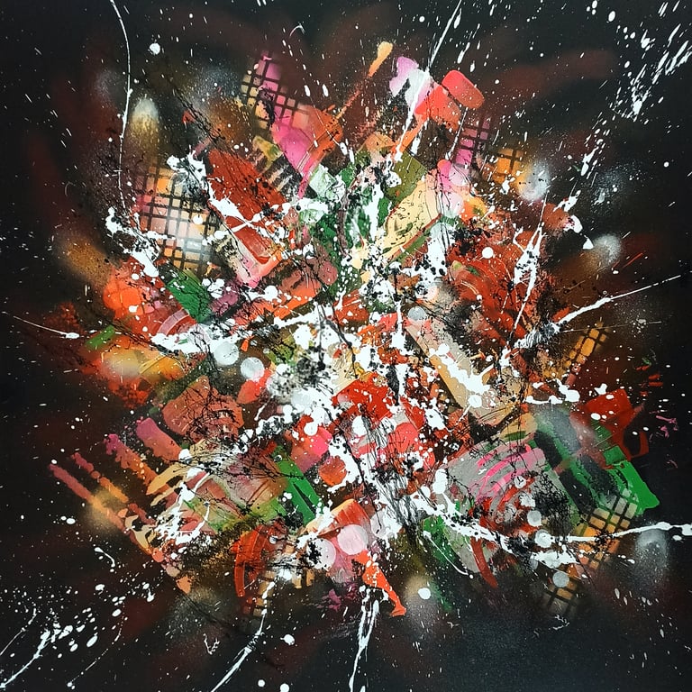 - Tuval üzeri akrilik ve sprey boya ile çalışılmıştır. - Eserin boyutu 70*70*2 cm’dir. - Koruma amaçlı olarak iki kat parlak akrilik vernik ile verniklenmiştir. - Eser orijinal olup, sanatçı imzalıdır. - Özgünlük belgesi ile birlikte gönderilecektir. - Fotoğraflardaki çerçeveler sadece gösterim amaçlıdır; eser çerçevesiz olarak gönderilecektir.
